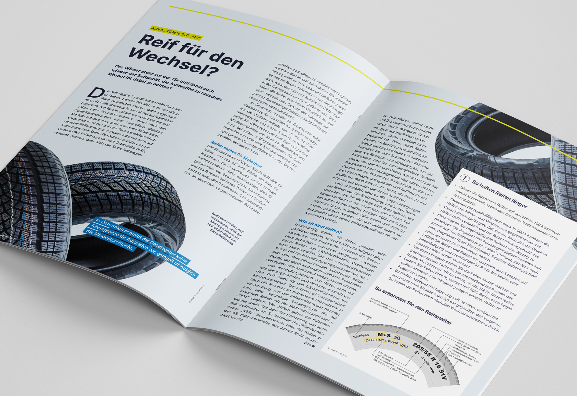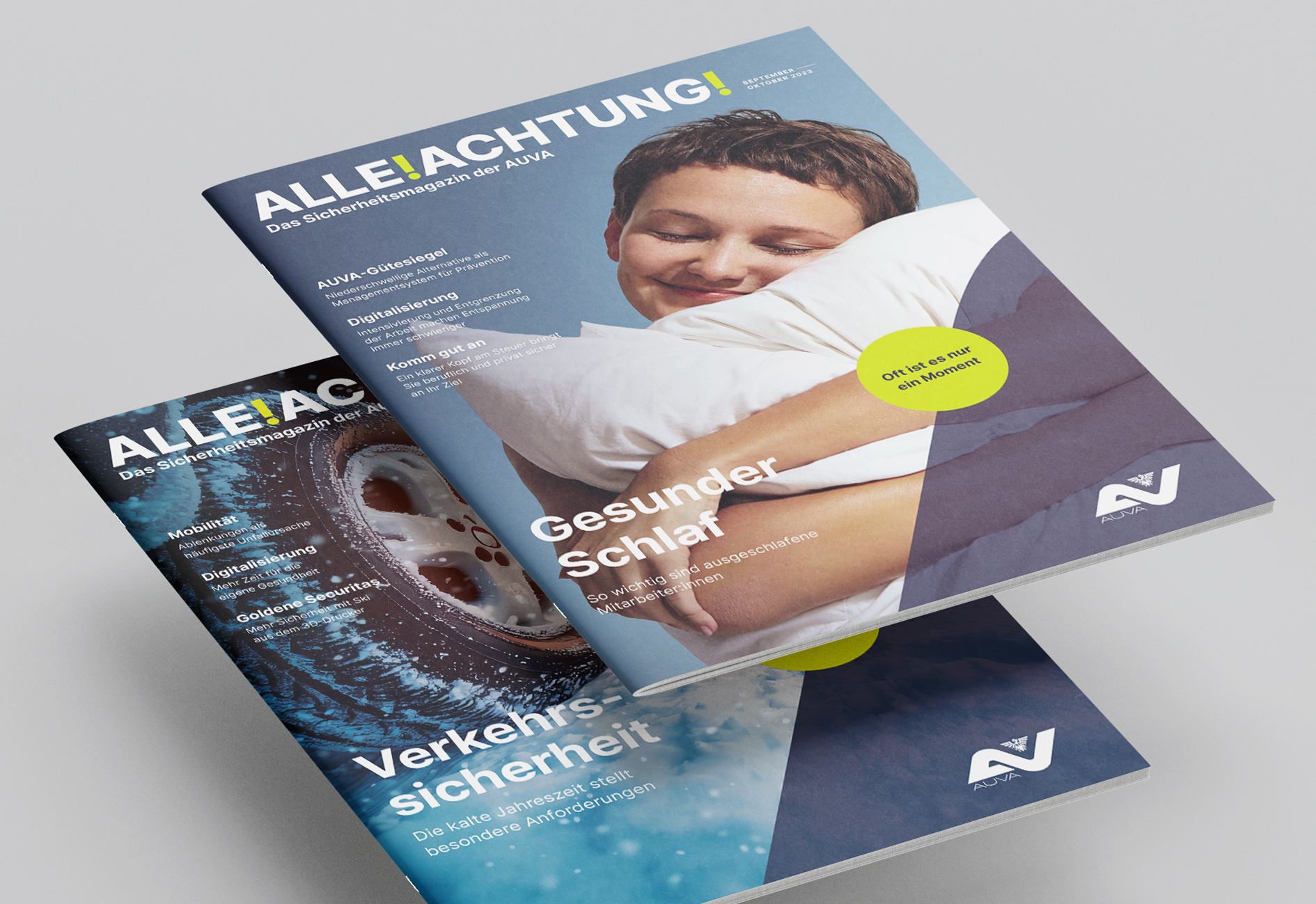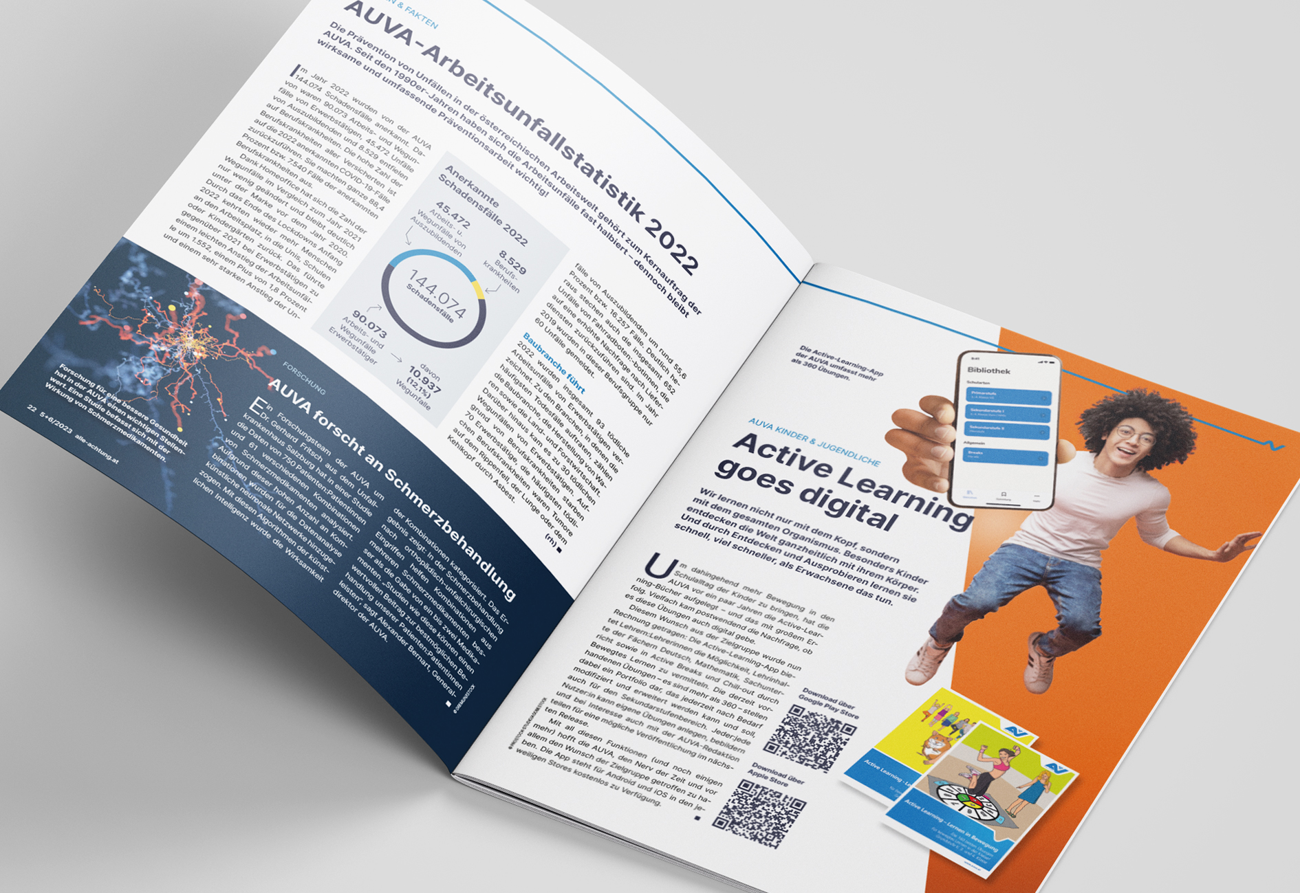 Das Magazin der AUVA erscheint sechsmal jährlich. Es ist barrierefrei gestaltet und entspricht den Anforderungen des Barrierefreiheitsgesetzes (BaFG). Ziel ist es, Inhalte so zugänglich wie möglich zu machen, damit Menschen mit unterschiedlichen Einschränkungen sie gut verstehen und nutzen können. Ich betreue das Magazin als Art-Direktorin seit seiner Entstehung im Jahr 2012.