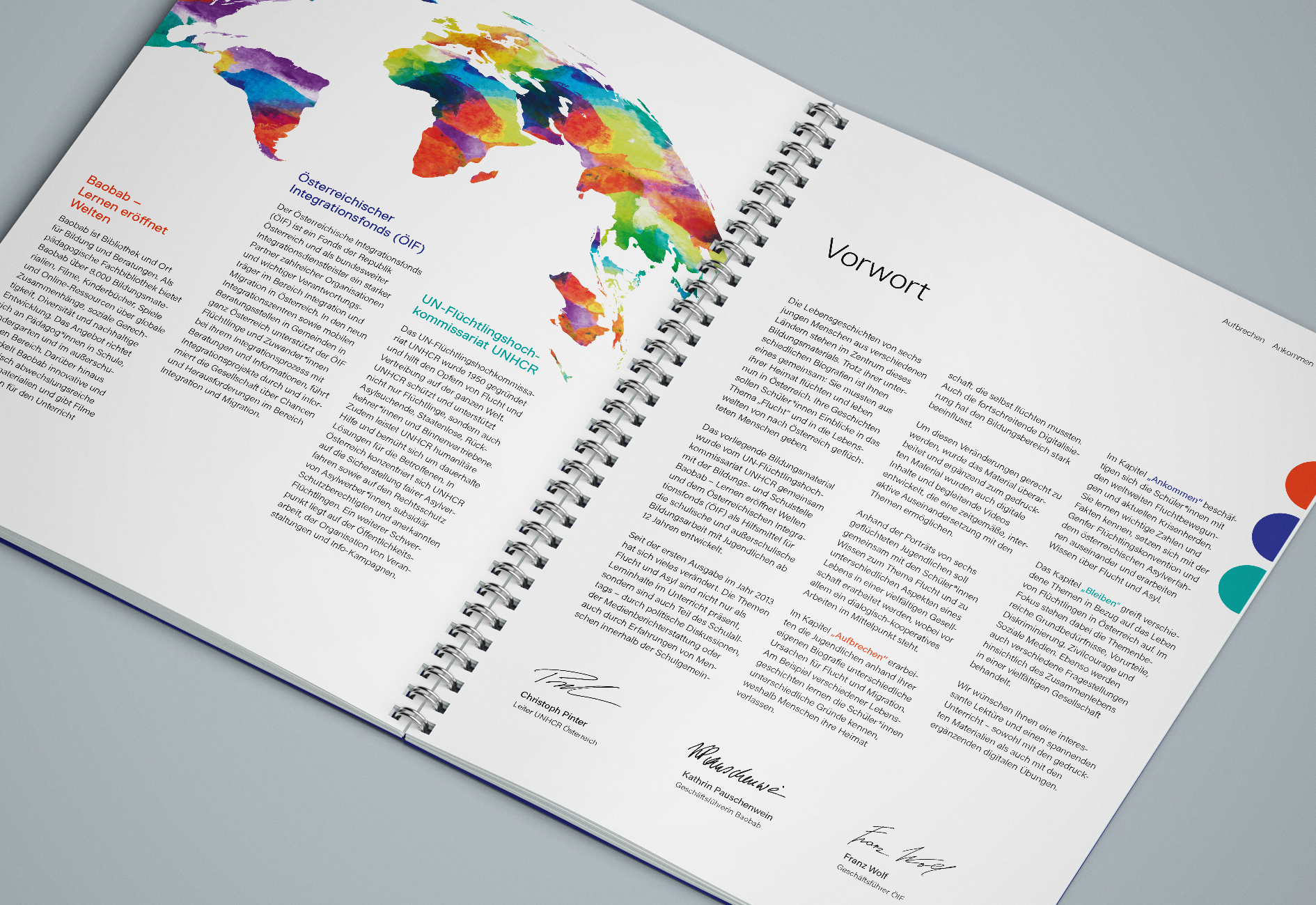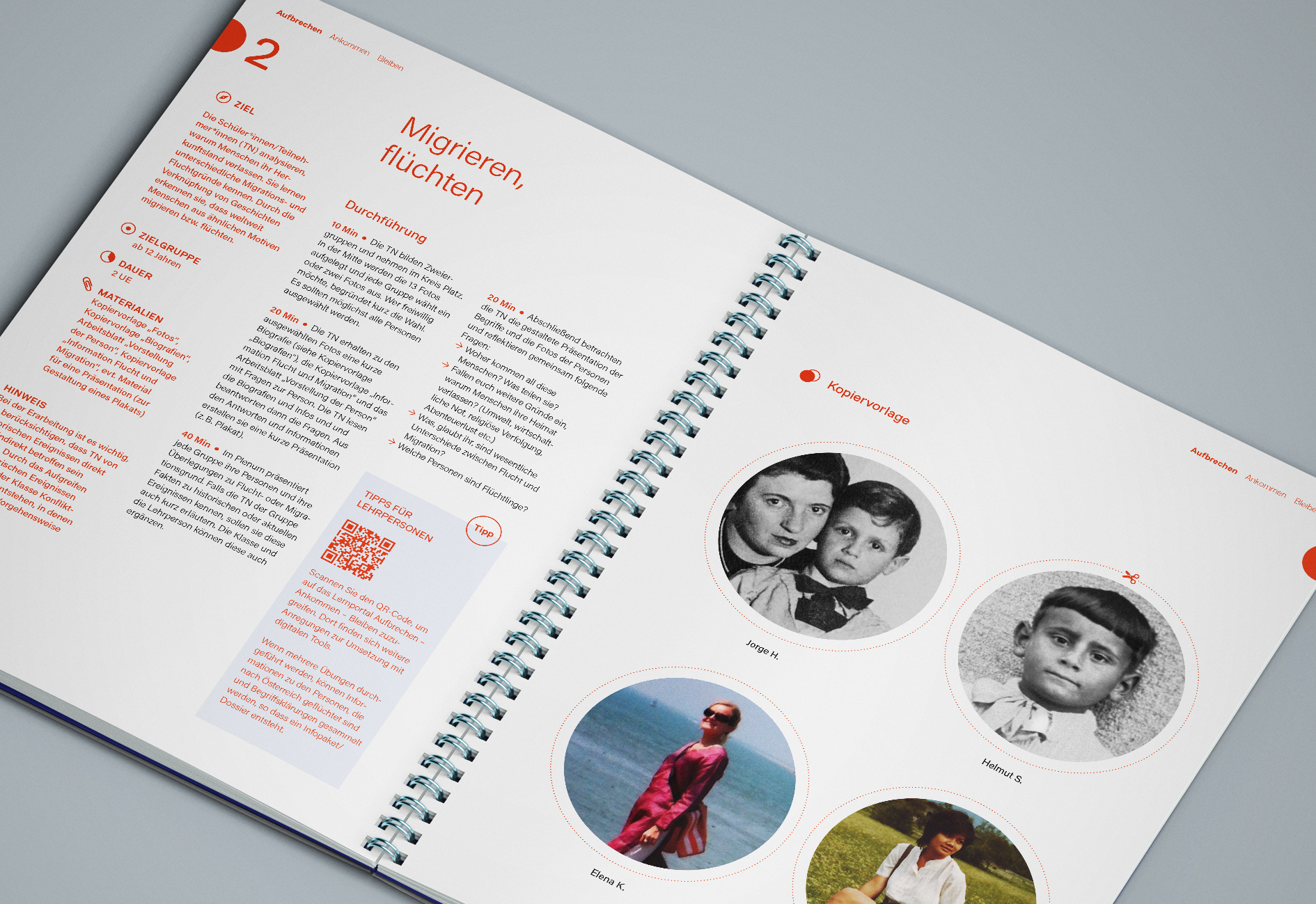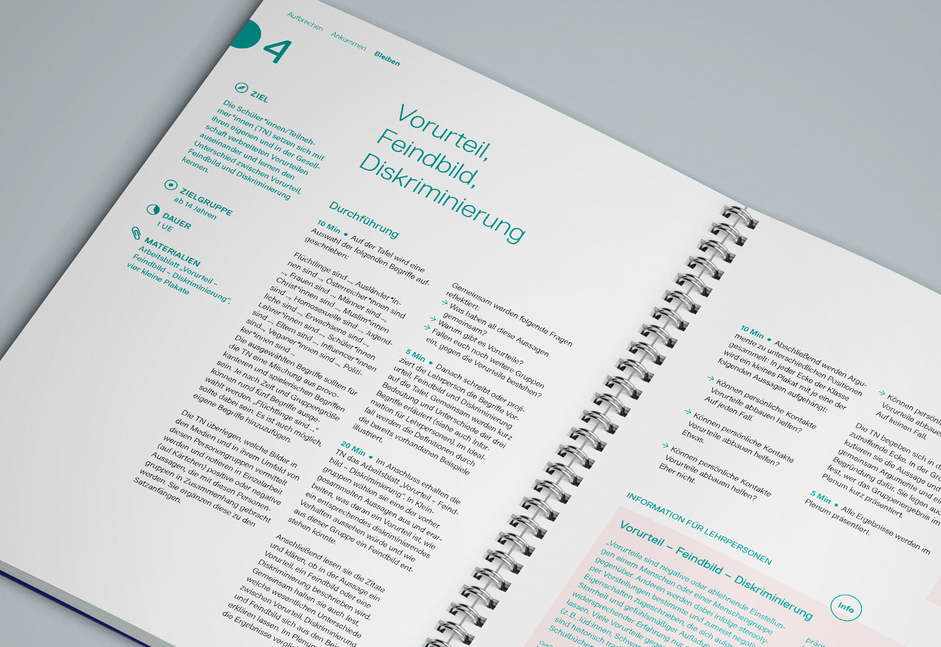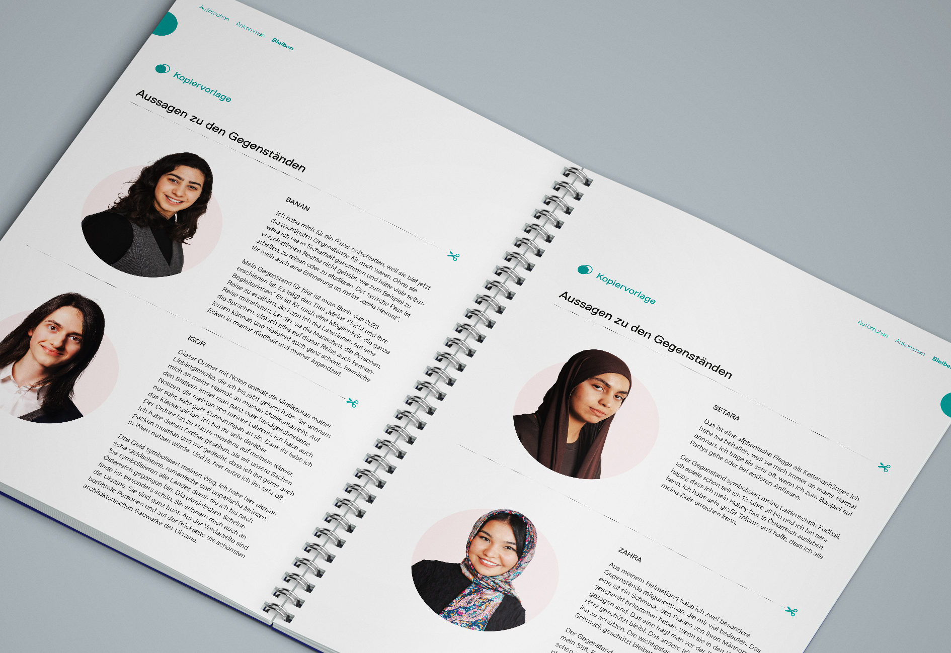 Das kostenlose Lehrmaterial für Bildungs- und Jugendarbeit umfasst drei Kapitel mit 20 flexiblen didaktischen Impulsen ab 12 Jahren. Im Mittelpunkt stehen Porträts junger Geflüchteter in Österreich, anhand derer Wissen zu Flucht, Integration und Leben in einer vielfältigen Gesellschaft vermittelt wird. Ich betreue das Projekt seit der ersten Ausgabe 2013 als Art-Direktorin. Es liegt mittlerweile in seiner siebten, überarbeiteten Version vor.
